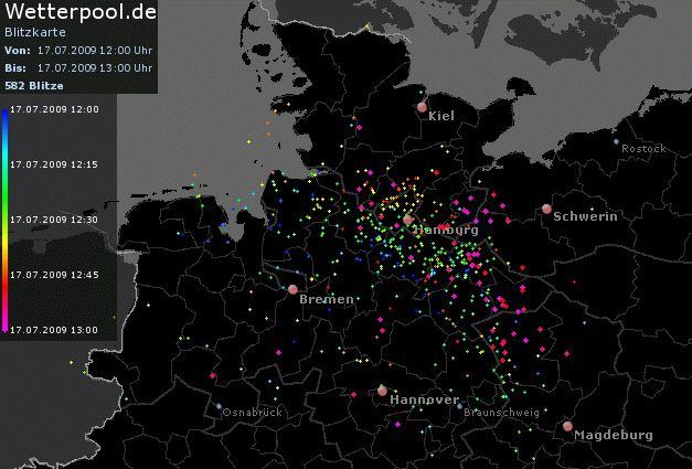 Überhaupt waren sehr wenig Leute unterwegs, weil es wie aus Kübeln goss und das Ganze von einem mittelschweren Gewitter begleitet wurde. Weil bereits vor meinem Start dunkelste Wolken aufzogen, entschied ich mich für die Laufstrecke an der Elbe entlang. Rechts von mir die Elbe und links der Hang der Blankeneser Alpen (75m) der dann von Blitzeinschlägen wohl eher bevorzugt worden wäre.