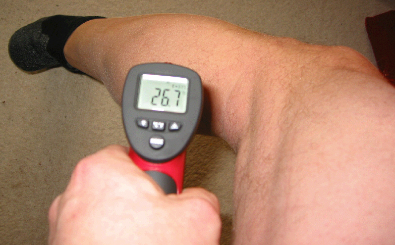 Es war heute zwar trocken, aber mit -3°C und leichtem Wind sehr kalt, bei wetter.com stehen sogar gefühlte -10°C. Da ich heute auch eher langsam lief, kamen speziell meine Oberschenkelmuskeln nicht auf Betriebstemperatur und schmerzten. Das brachte mich auf die Idee, zu Hause angekommen mal die Oberflächentemperatur zu messen. Die meiste „Abwärme“ erzeugt offensichtlich mein Kopf, gemessen auf der Stirn die noch nicht mal durch das Stirnband – auch wenn es so heißt – abgedeckt war.