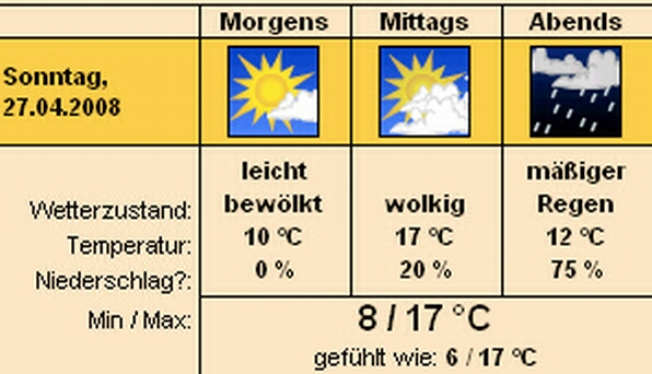 Aber apropos anziehen: Die Wettervorhersage wechselte auch fast täglich, allerdings ist drei Tage vorher mit dieser Vorhersage die Wahrscheinlichkeit recht hoch, dass es auch so zutrifft (Quelle: Wetter.com):